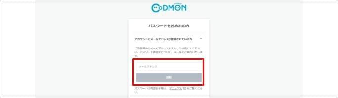 - [アカウントにメールアドレスが登録されている方] をクリックし、登録のメールアドレスを入力のうえ、 [送信] をクリックします。