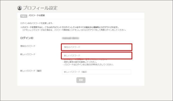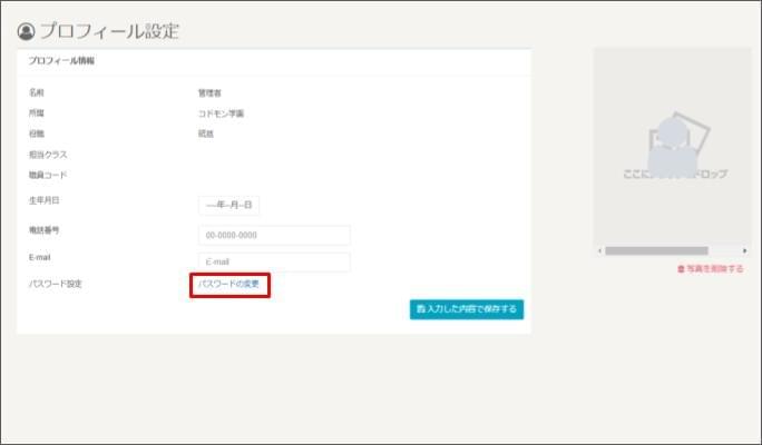 ログインパスワードを変更する2026年2月3日 更新 職員管理画面右上の [ご自身のお名前] をクリックします。 [プロフィール設定] をクリックします。 [パスワードの変更] をクリックします。 「現在のパスワード」と「新しいパスワード」を入力します。 [変更] をクリックします。