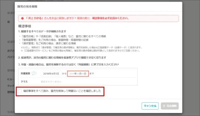 - 削除すると、削除した園児(児童)に関わる全ての情報および、卒園(退園)後も保管義務のある個人帳票なども削除されます。