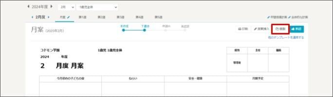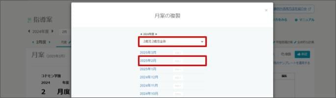 指導案を複製する2026年1月29日 更新指導案を複製するには、指導案作成の権限が「編集可能」であることが必須です。 [記録と計画] > [指導案] をクリックします。 作成済みの複製元となる指導案の月、クラスを選択します。 作成済みの複製元となる指導案のタブを選択します。 [複製] をクリックします。 複製したいクラスを選択し、複製したい年月をクリックします。 複製の確認画面の [複製] または [OK] をクリックします。