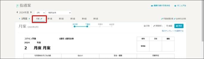個人月案を作成する2026年2月17日 更新個人月案を作成するには、指導案作成の権限が「編集可能」であることが必須です。 このページの操作を行うには、以下の設定が事前に必須です 個人月案の利用設定をする 園児(児童)を個別で登録する [記録と計画] > [指導案] をクリックします。 作成したい月、クラスを選択します。 [月案] のタブを選択します。 画面下にある入力項目をクリックします。 直接入力するか、文例がある場合は [挿入] をクリックします。文例の登録手順は、指導案の文例を登録するをご確認ください。 右下の [保存] をクリックします。