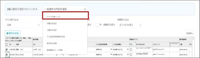 - 画面上の [一括操作の内容を選択] > [クラスを繰り上げ] を選択します。