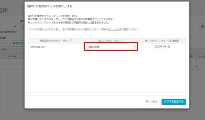 2つ以上のクラス・グループの進級がある場合は、進級するクラス・グループの数に合わせて追加してください。 - 左上の「クラス絞り込み」のプルダウンから対象園児(児童)のクラスを選択します。