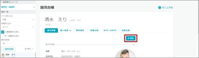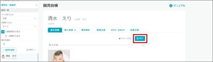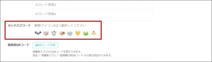 【設定】タッチパスワードを設定する2026年1月29日 更新 [園児(児童)台帳] をクリックします。 [園児(児童)名] をクリックします。 「基本情報」 > [編集] をクリックします。 [登降園(入退出)時の認証] > [タッチパスワード] で設定するパスワードの動物マークと順番を2つ選択します。 同じ動物を2つ連続で設定することもできます。 [保存] をクリックします。