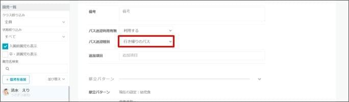 - 「バス送迎種別」のプルダウンをクリックし、[行き帰りのバス、行きのバスのみ、帰りのバスのみ] のいずれかを選択します。
