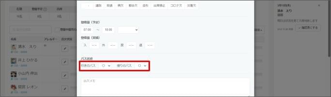 - 「出欠」で「 – 」、「遅刻」、「早退」、「病欠」、「都合欠」を選択すると、自動的に「行きのバス」と「帰りのバス」の乗車予定が選択されます。