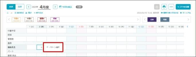 - 月次タブの画面で、臨時シフトを作成したい日付の職員のシフト枠をクリックし、[パターン選択] をクリックします。