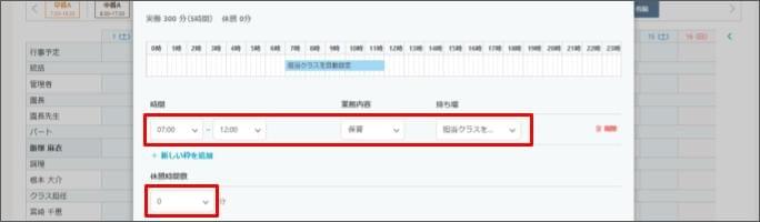 - 「時間、業務内容、持ち場、休憩時間数」を選択します。