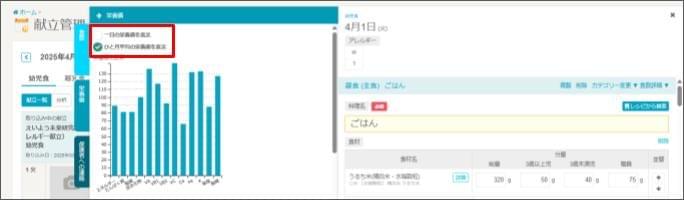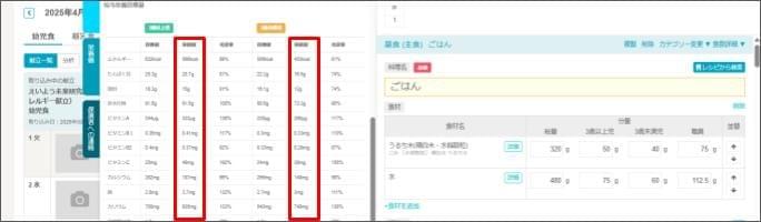 - 給与栄養目標量を設定している場合、充足率が確認できます。