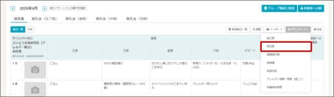 食材の発注書をダウンロードする2026年2月17日 更新ダウンロードするには、給食管理の権限が「編集可能」であることが必須です。 このページの操作を行うには、以下の操作が事前に必須です 手入力で予定食数を登録する [給食管理] > [献立管理] をクリックします。 発注書をダウンロードしたい月を選択します。 [ダウンロード] > [発注表] をクリックします。