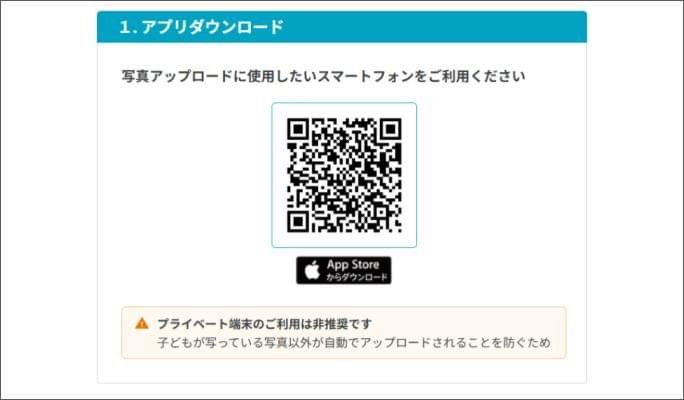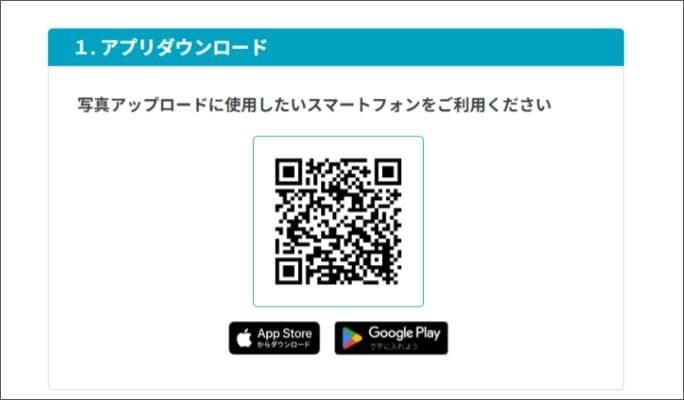 - 「1.アプリダウンロード」のQRコードを撮影に利用する端末のカメラで読み取り、アプリをインストールします。