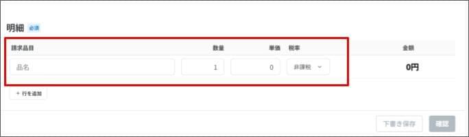 - 「明細」の「品目、数量、単価、税率」を入力します。
