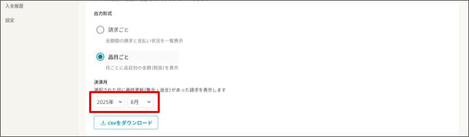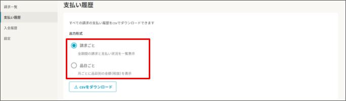 支払い履歴をダウンロードする(いつでも請求)2026年2月13日 更新ダウンロードするには、いつでも請求の権限が「編集可能」であることが必須です。 [請求管理] > [いつでも請求] をクリックします。 左側の [支払い履歴] をクリックします。 [請求ごと] または [品目ごと] のいずれかを選択します。 請求ごと:全期間の支払い履歴が出力されます 品目ごと:月ごとに品目別の金額が出力されます 品目を選択した場合は、ダウンロードしたい年月を選択します。 [csvをダウンロード] をクリックします。