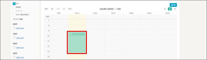 開始したい日の開始時間の部分をクリックし、そのまま終了時間まで下にドラッグしてください。- 終日の場合は、カレンダー上部の [終日] をクリックします。