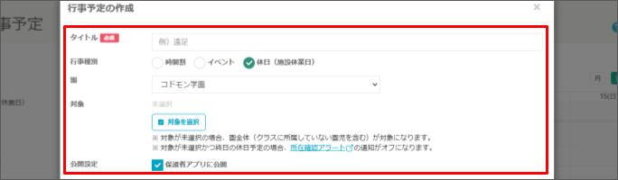 ※利用申請受付機能をご利用の場合、保護者アプリ上に「施設休業日」として表示され、出欠連絡ができません。 - [対象を選択] をクリックし、公開対象にチェックを付けます。