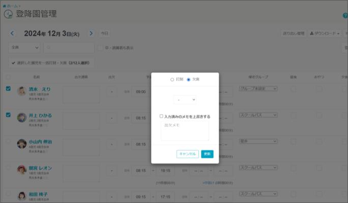 - まとめて欠席を登録したい園児(児童)名の横ボタンにチェックを付けます。