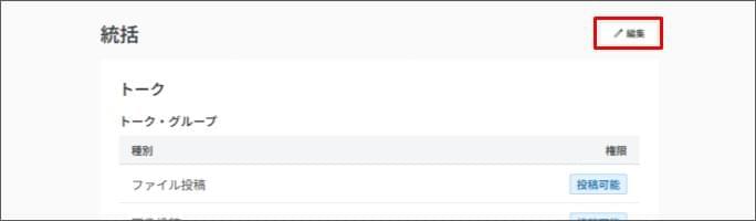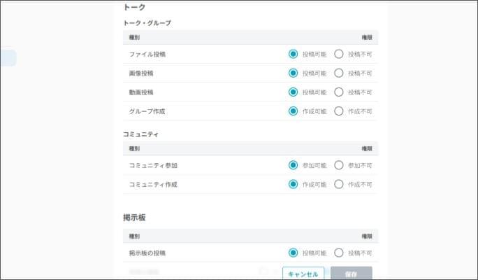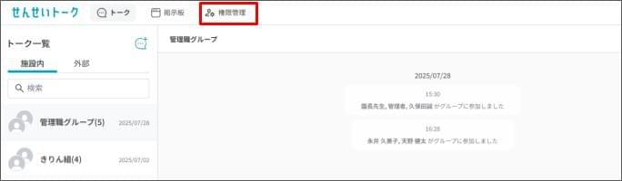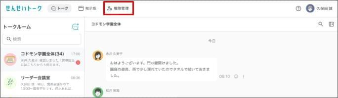 【設定】せんせいトークの各種権限を設定する2026年3月9日 更新権限設定の操作は、職員管理画面の役職設定でせんせいトーク管理の権限が「編集可能」であることが必須です。権限設定は、せんせいトーク(ブラウザ)のみ操作できます。 [権限管理] をクリックします。 権限を設定したい役職をクリックします。 [編集] をクリックします。 「トーク」または「掲示板」の各項目ごとに権限を選択します。 右下の [保存] をクリックします。