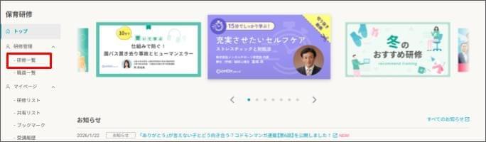 - [保育研修(コドモンカレッジ)] をクリックします。