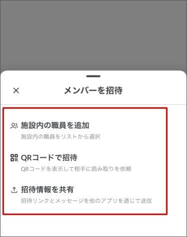 - 右上の [招待] > [施設内の職員を追加、QRコードで招待、招待情報を共有] のいずれかをタップします。