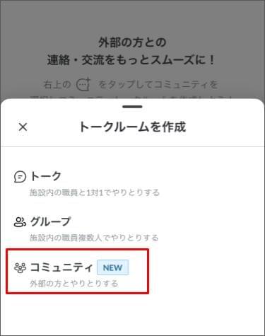 - [コミュニティ] > 「コミュニティ名」を入力し、右上の [作成する] をタップします。